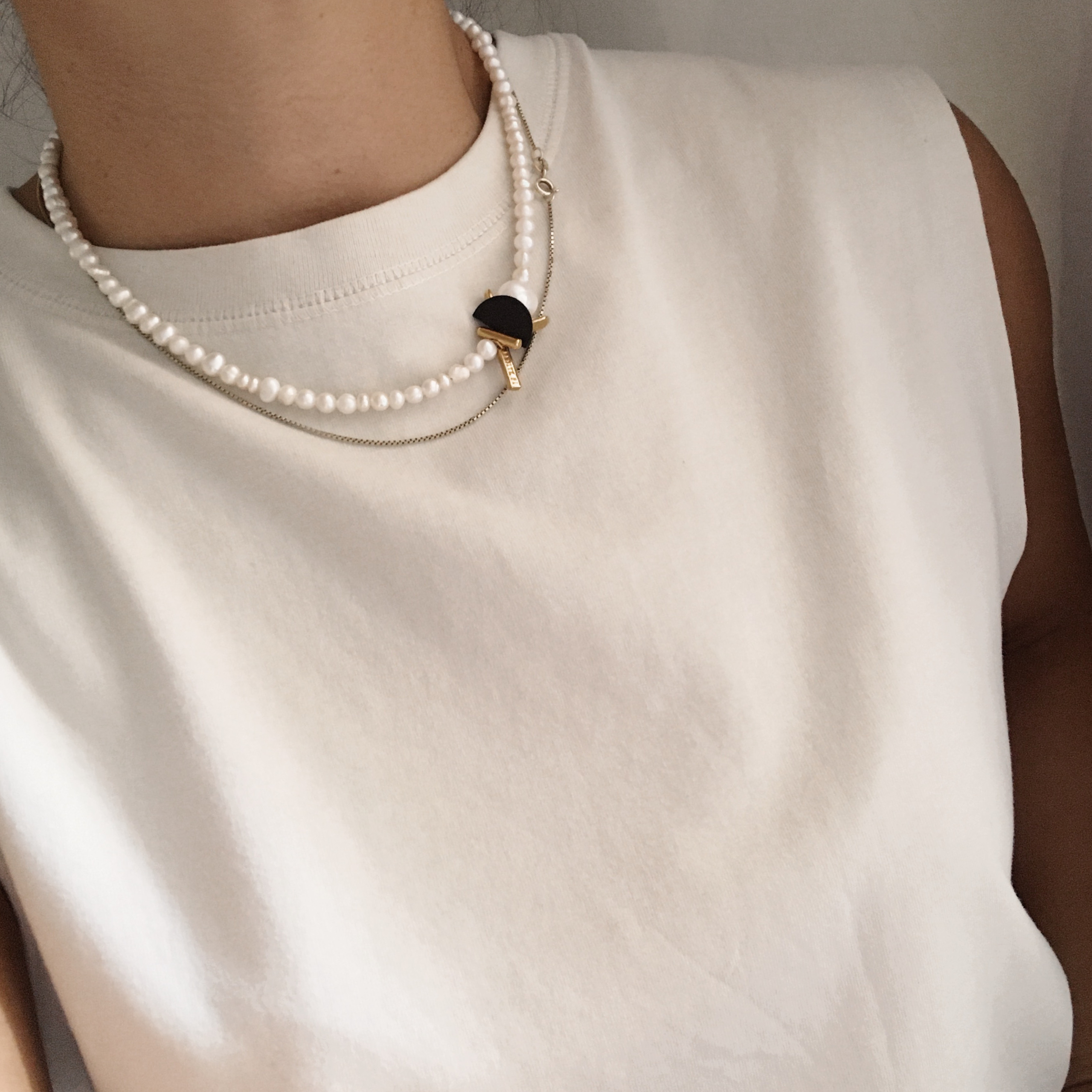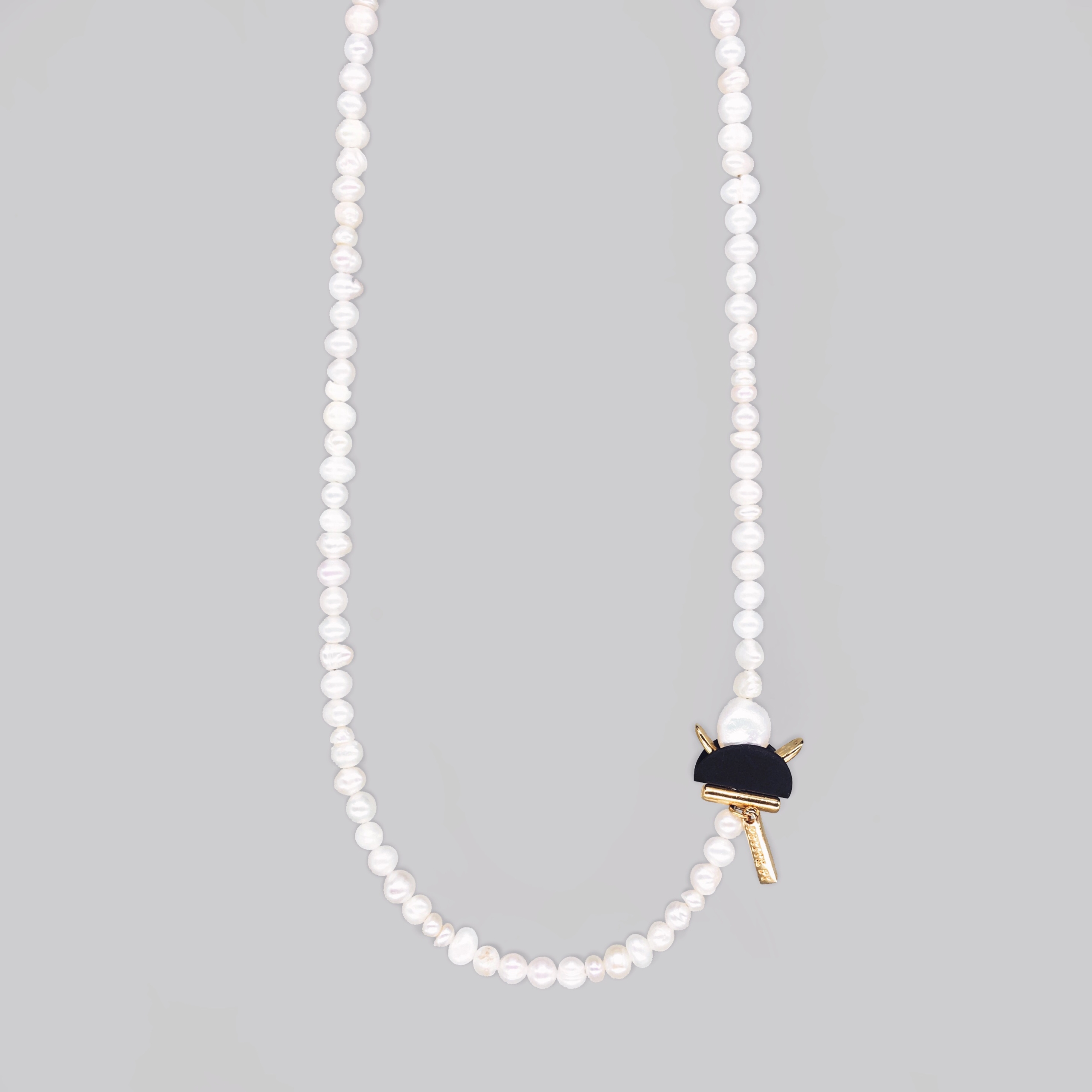 Κολιέ με φυσικά μαργαριτάρια καλλιέργειας και χρυσές λεπτομέρειες σε συνδυασμό με πλαστικό υλικό βιομηχανικής χρήσης, χρώματος μαύρo.